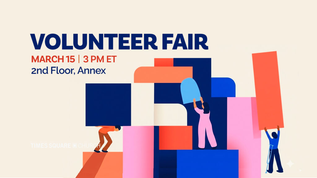 Are you interested in finding opportunities to participate within Times Square Church? Join us on March 15 at 3pm on the second floor for our Volunteer Fair! This event is an opportunity to explore the diverse ministries and volunteer opportunities TSC offers.